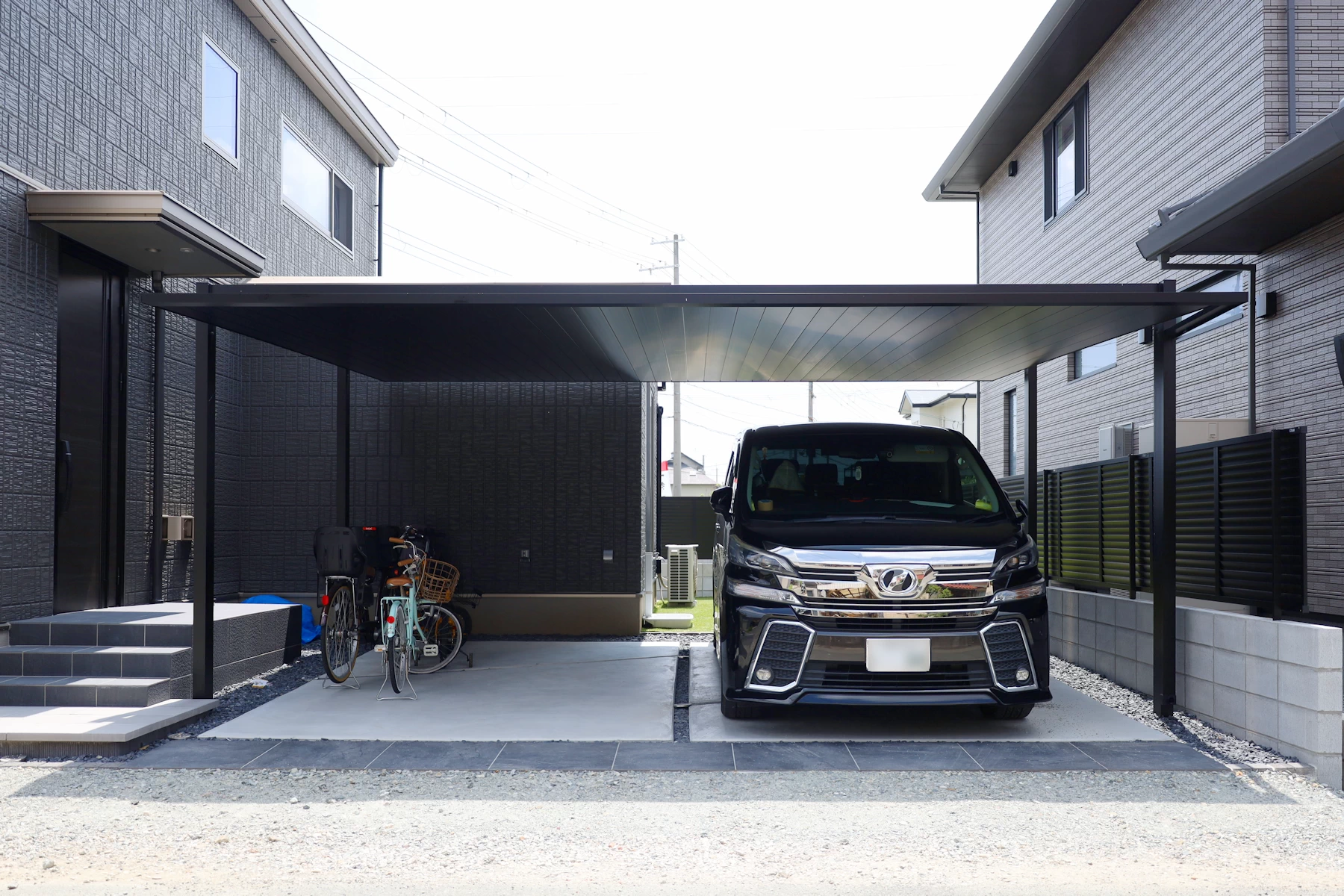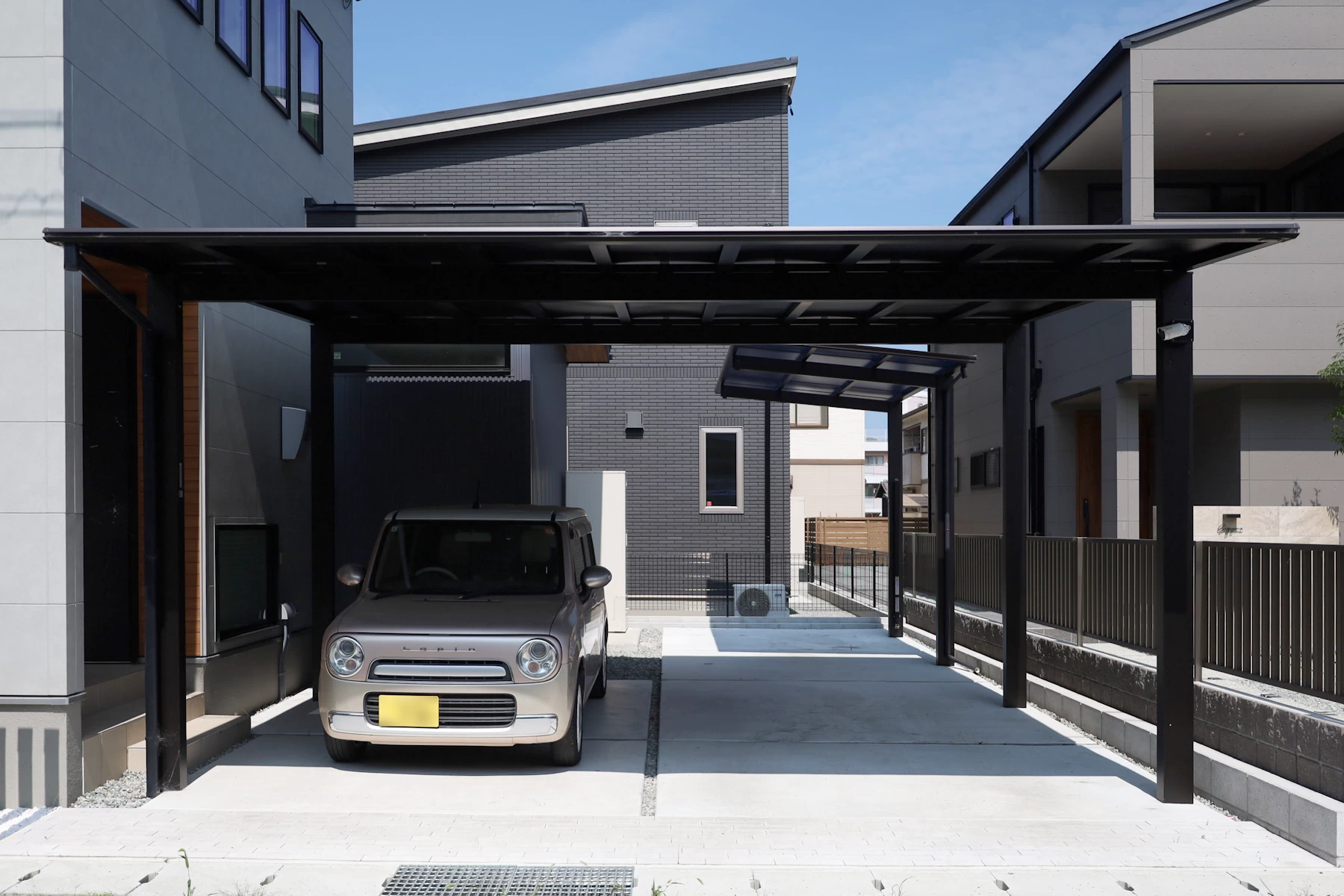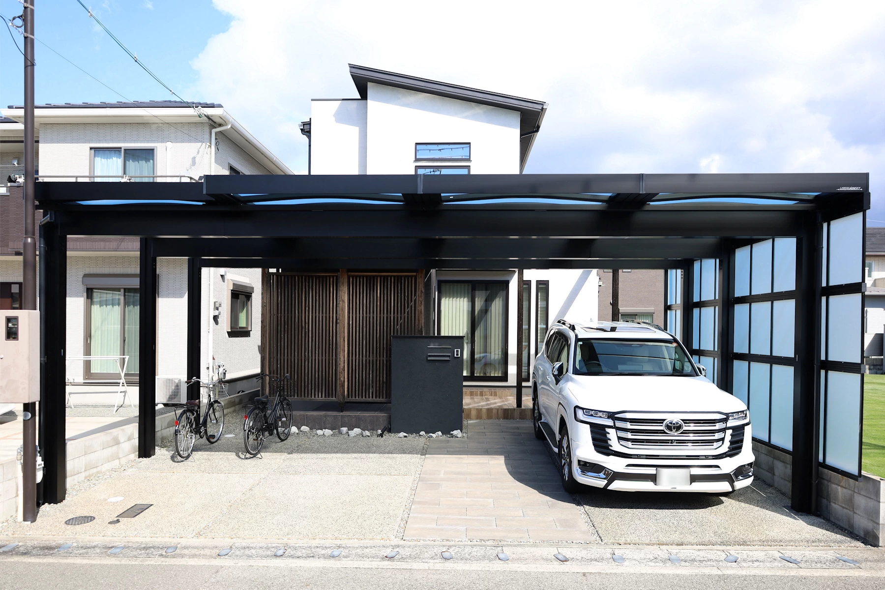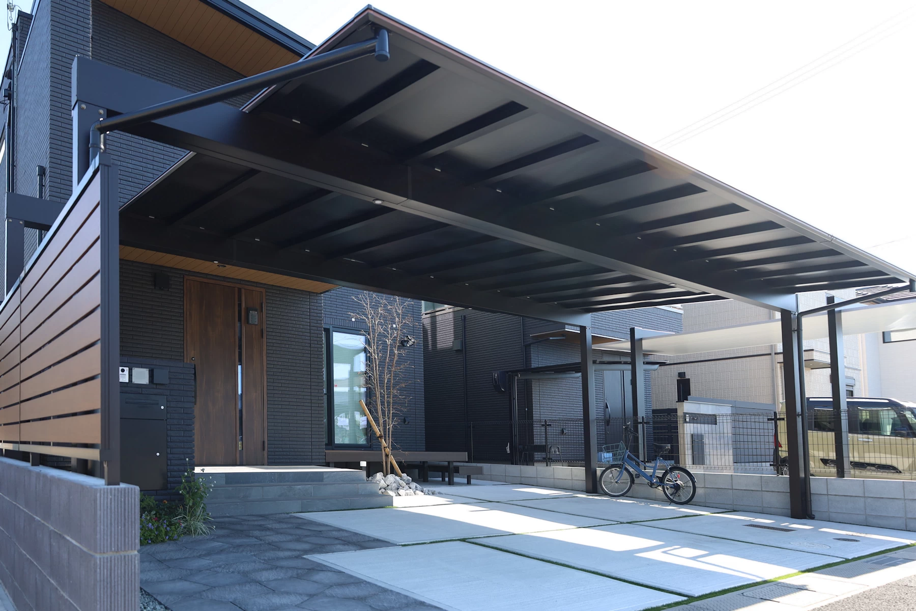 モダンな外観によく似合うオープンガレージを活かしたブラックカーポート