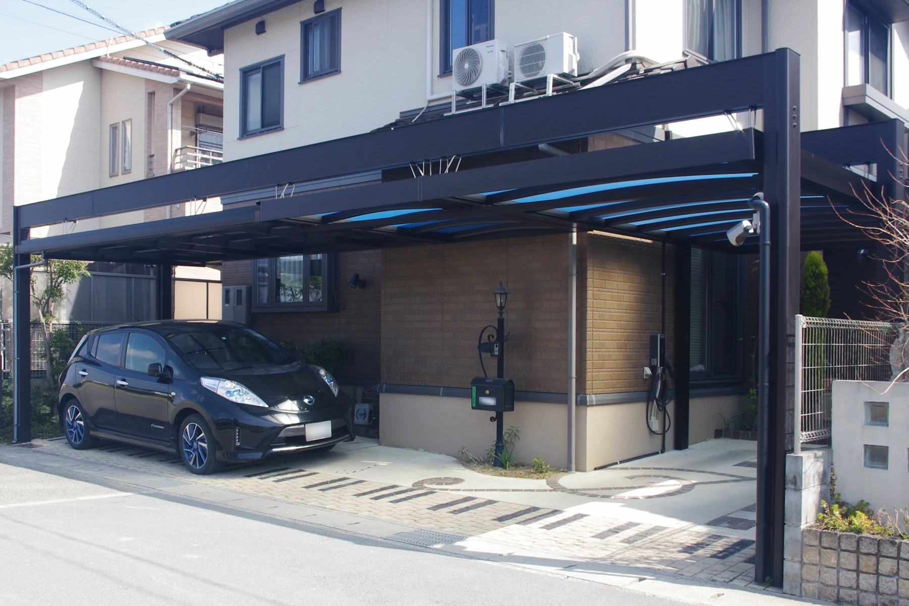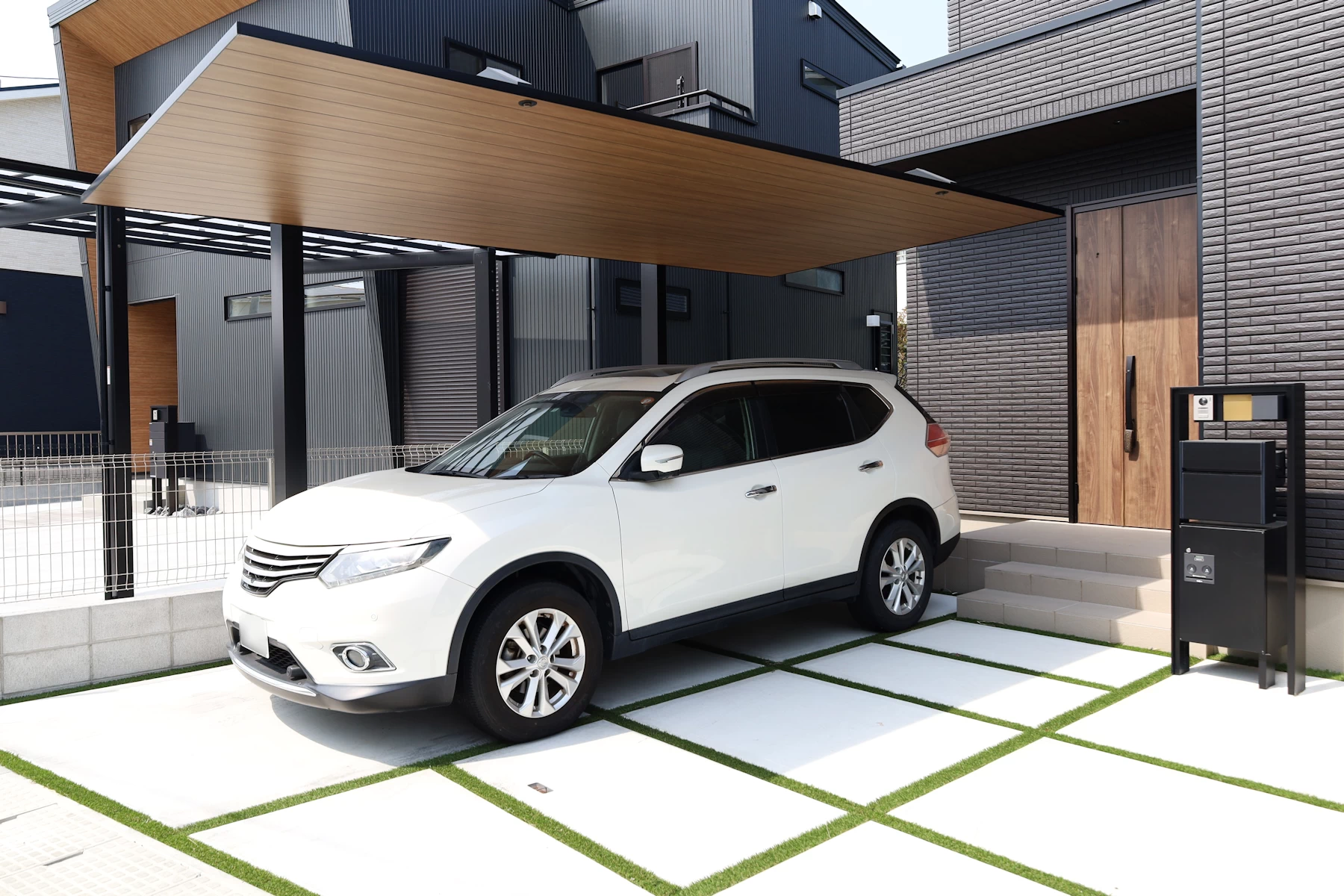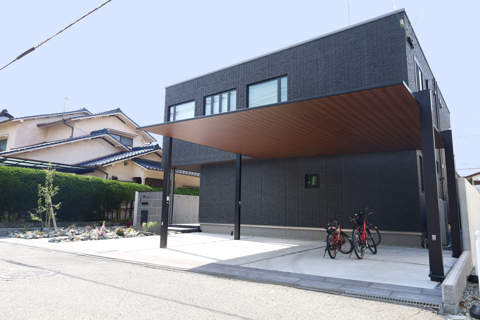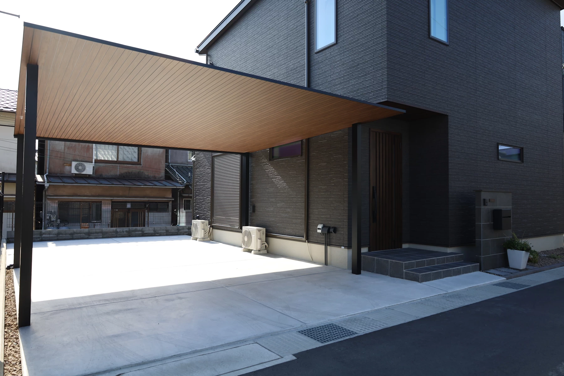 モダンな外観によく似合うオープンガレージを活かしたブラックカーポート