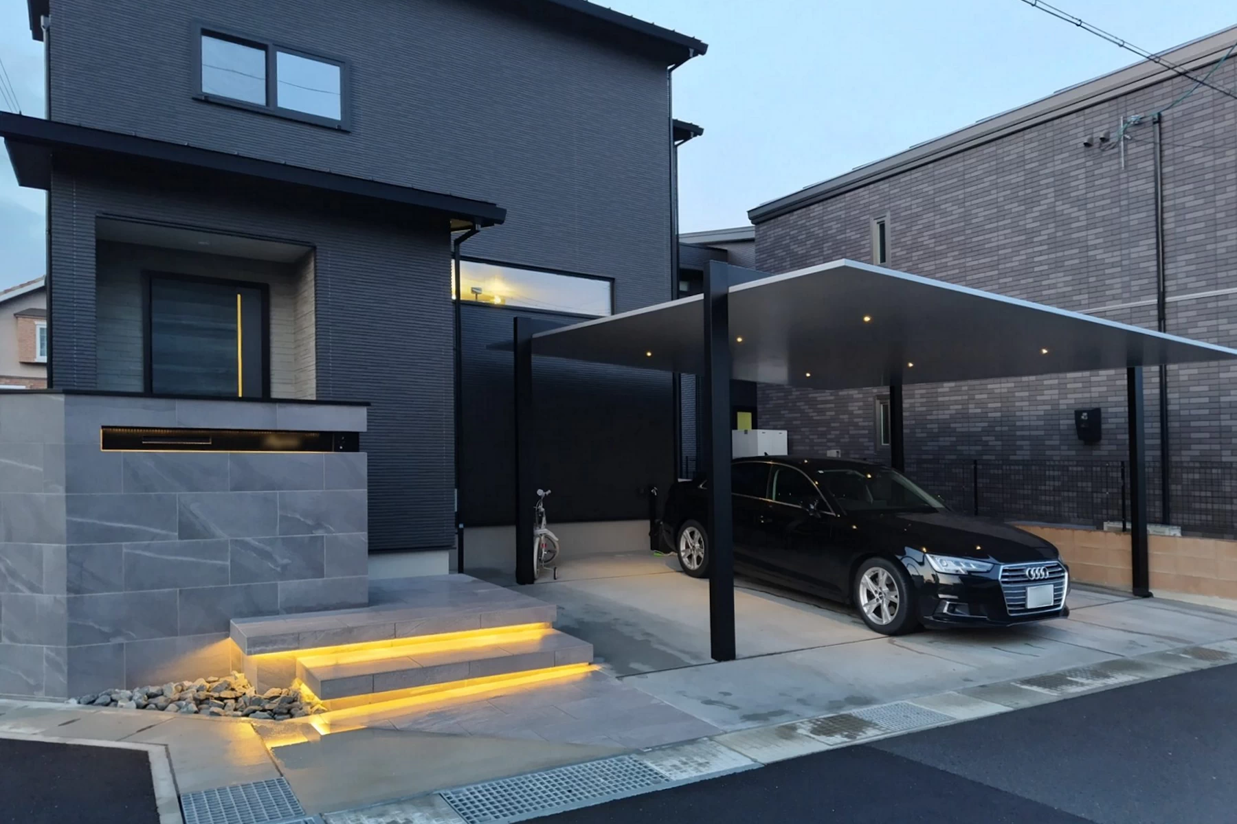 施主様ご希望のデザイン性の高いカーポートをポイントに、クールなイメージで構成