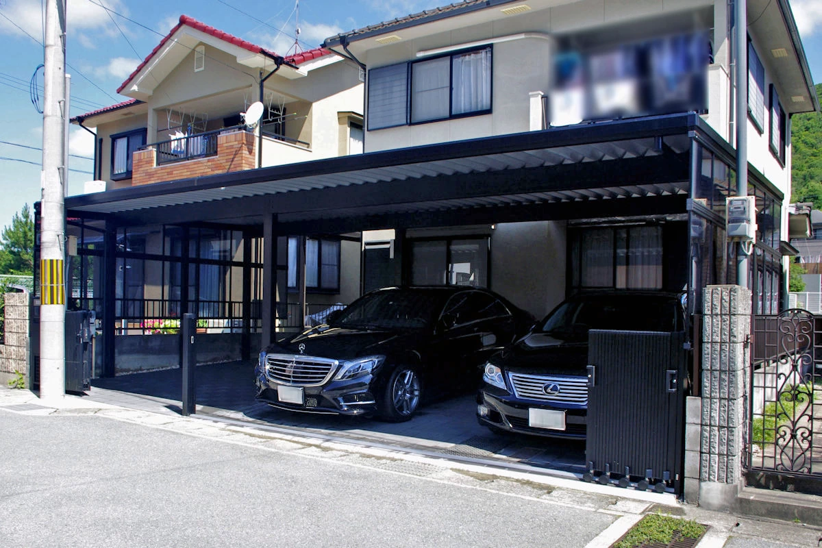 高低差のあるガレージにブラックポリカカーポート2台で外構の機能性と印象が変化