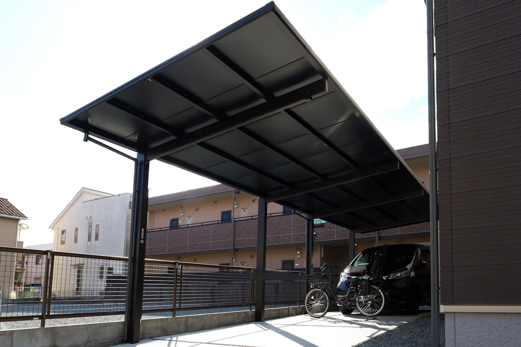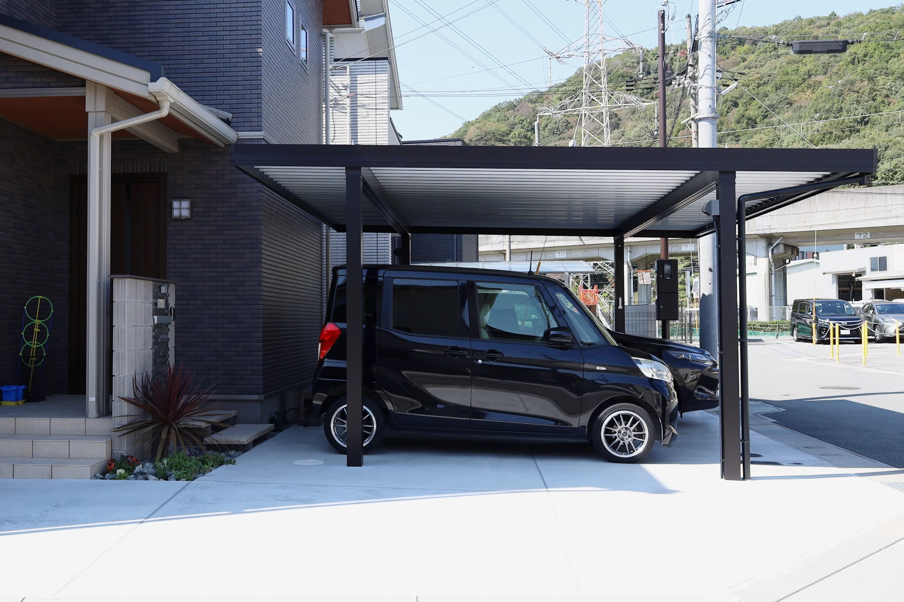 ブラックのアルミ屋根と柱で、ミニマムでクールなカーポート