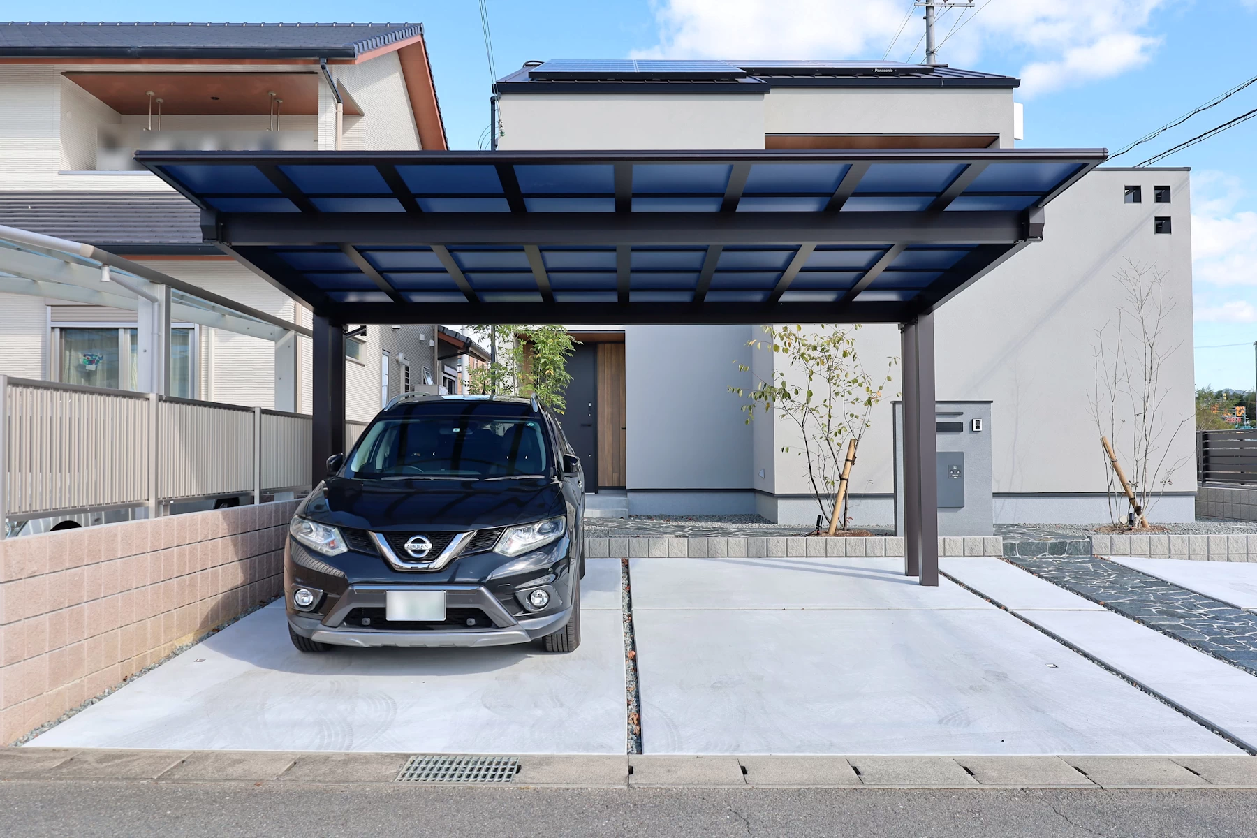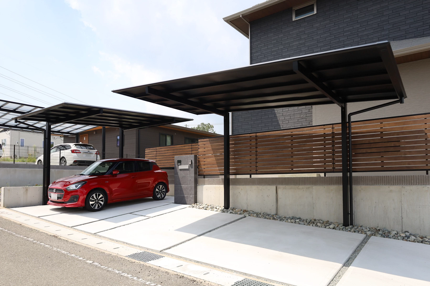 3台用カーポート屋根が敷地幅を覆い、機能性と外観の一体感が抜群