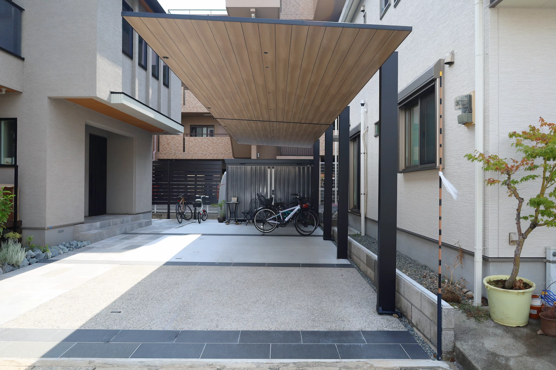 濃いブラウンの木調天井が印象的なモダンデザインのカーポート