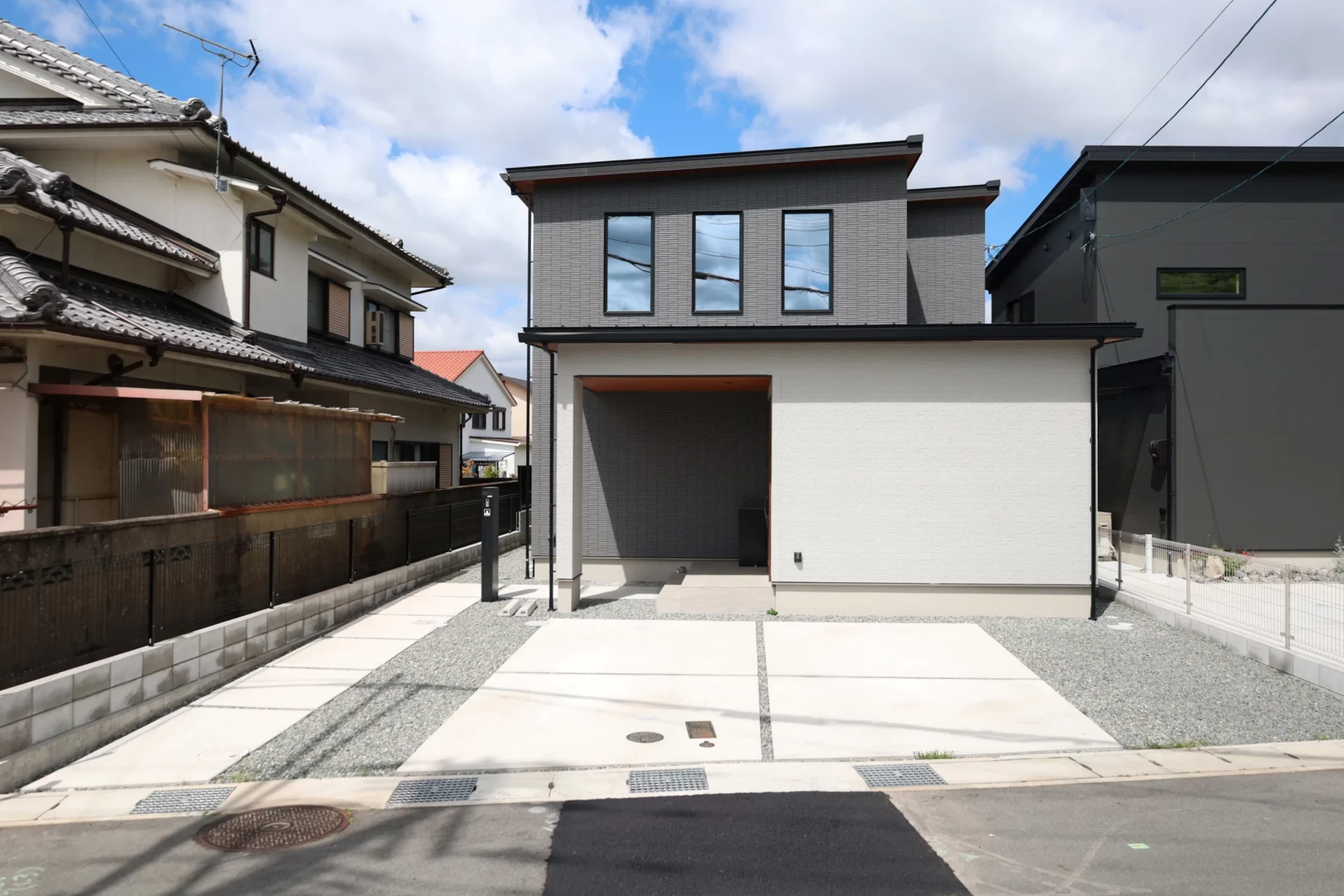 玄関へのアプローチ通路と2台分の駐車スペースはコンクリート土間仕上げ、残りは砂利で直線的にすっきりとデザインしました。開放的なオープン外構は車の出し入れがスムーズで、余裕のあるスペースは来客時に臨時ガレージとしても使えます。